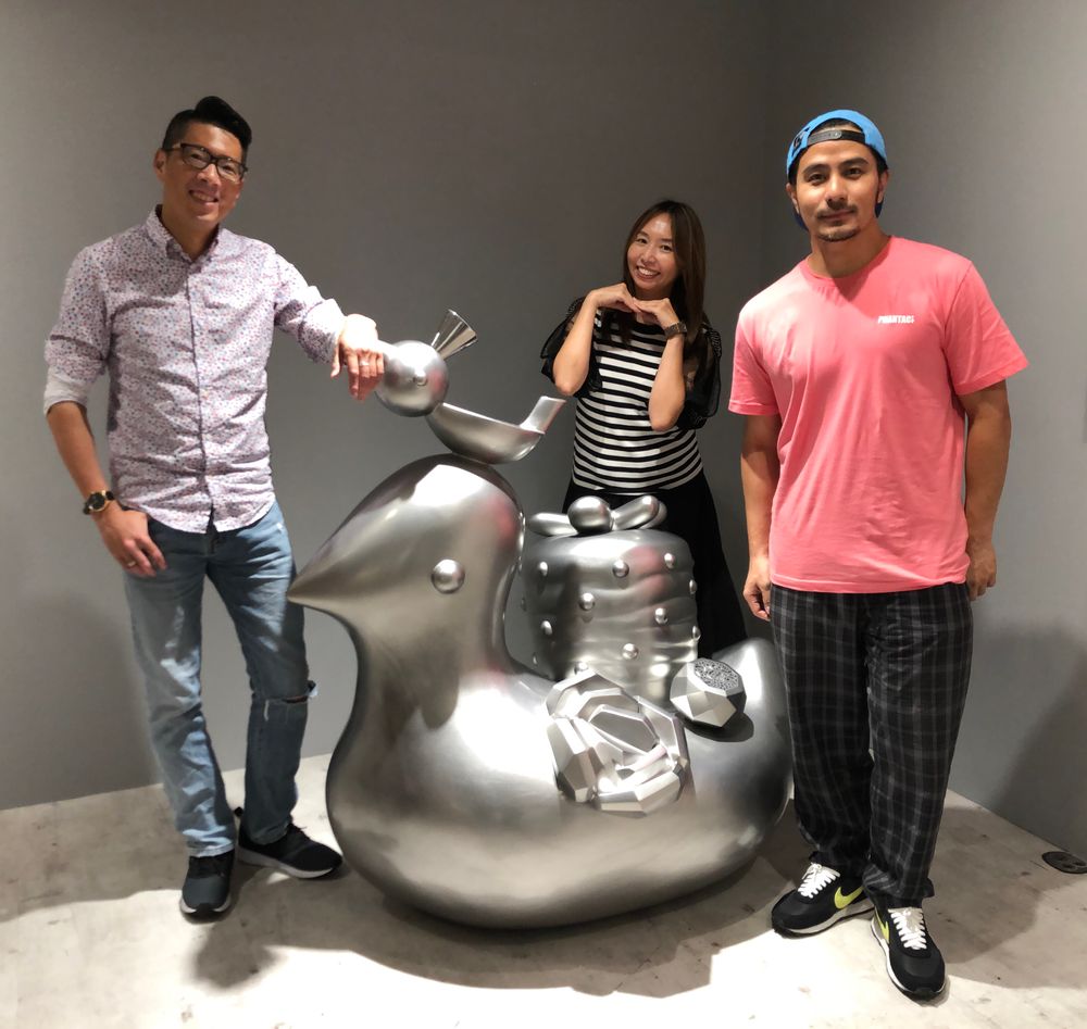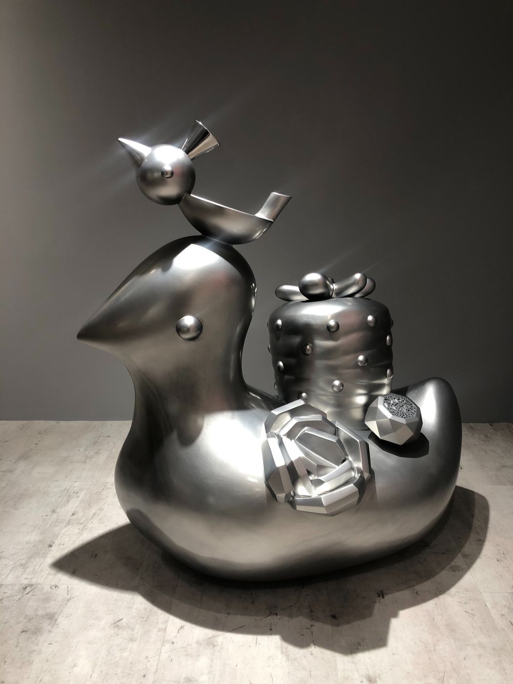Three large sculptures stand in the exhibition hall: a bear holding a ball-shaped object, a rabbit disguised as its own image with leaves, and a duck covered with strawberries, diamonds, and roses. To make them physical in time, he uses them to symbolize the most important emotional bond in his life, undoubtedly strengthening his courage, conviction, love, and hope in support of his ongoing adventure.